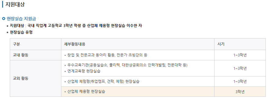 현장실습 지원금 지급대상은 국내 직업계 고등학교 3학년 학생 중 산업체 채용형 현장실습을 이수한 학생입니다.