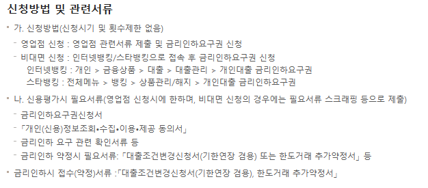 영업점 방문 신청시 금리인하 요구권 신청서, 개인(신용)정보조회 수집.이용.제공 동의서, 금리인하 요구 관련 확인 서류 등이 필요합니다.