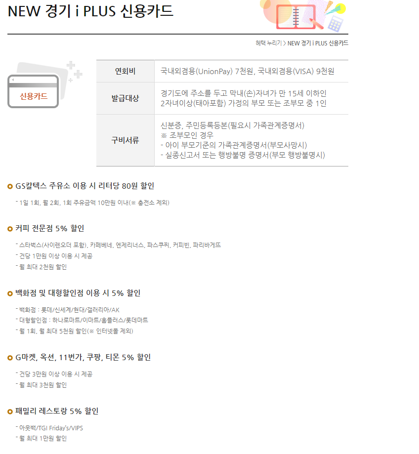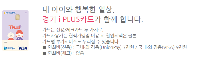 경기도 다둥이카드는 경기 아이플러스카드라는 이름으로 사용할 수있고, 신용카드와 체크카드 두 가지입니다. 체크카드는 연회비가 없지만 신용카드는 연회비가 있습니다. 국내외 겸용(Unionpay)는 7천원이고, 국내외 겸용( VISA)는 9천원입니다.
