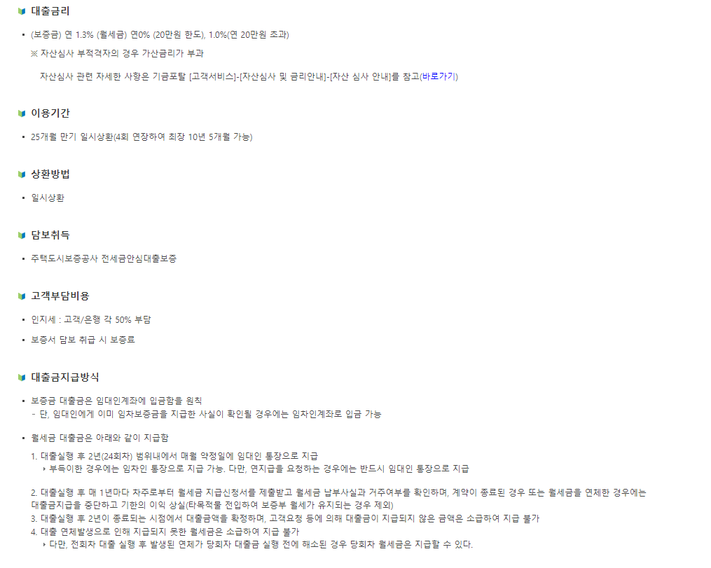 청년전용 보증부 월세 대출은 만 19세 이상 34세 이하 청년층에게 저금리로 전월세 보증금과 월세는 지원하는 주택도시보증공사 상품입니다. 대상 주택은 전용면적 60m² 이하인 주택으로 주거용 오피스텔도 해당됩니다. 임차보증금은 5,000원 이하, 월세 70만원이하입니다. 소득은 부부합산 연소득 5,000만원이하, 순자산가액 3억2,500만원 이하인 무주택 단독 세대주와 예비 세대주입니다. 조건이 충족되면 최대 3,500만원, 월세는 1,200만원(월 50만원 이내, 최대24개월)까지 1%대의 저금리로 청년전용 보증부 월세 대출이 가능합니다. 하지만 신청자의 재직 기간에 따라 대출한도가 다를 수 있기때문에 주택도시기금에서 자세하게 확인하시는 것이 좋습니다. 대출상환바는 법은 만기 일시상환이고 중도상환수수료는 없습니다. 대출기간은 25개월이고 4회 연장해서 최장 10년 5개월까지 이용할 수 있습니다. 무주택자를 위한 제도이기때문에 청년전용 보긍부 월세 대출이 실행된 이후 주택 취득이 확인되면 대출금을 상환해야 합니다.