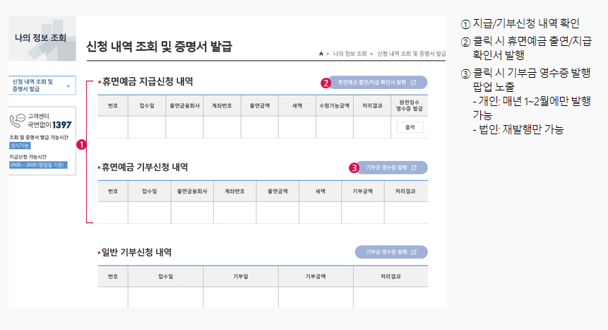 1천만원을 초과하는 계좌의 잔액은 서민금융통합지원센터에 직접 방문해서 신청하거나 해당 은행 영업점에 방문신청을 해야 합니다. 서민금융진흥원 휴면예금 찾아줌 사이트에서 소액이라도 휴면예금 찾기를 하신분들은 휴면예금 출연/지급 확인서 발급을 통해 인쇄할 수 있습니다.