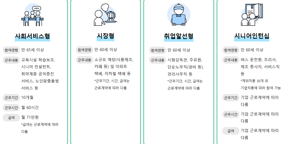 2023 노인 일자리 종류는 사회서비스형, 시장형, 취업알선형, 시니어인턴십등으로 나누어집니다. 각 분야 별로 참여연령과 활동기간, 활동비, 근무내용등이 다르게 되어있습니다. 그리고 가장 보기쉽고 편리한것은 노인일자리 여기홈페이지가 쉽고 신청접수와 지역별 현재 모집중인 일자리도 확인해볼 수 있습니다.