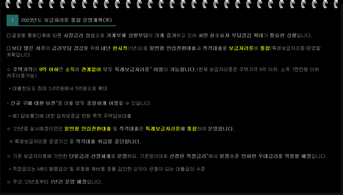 안녕하세요. 럭키세븐입니다. 요즘 부동산 경기 침체와 너무 치솟은 시세에 고금리로도 대출을 받아도 내집마련이 더욱 어려운상황입니다. 정부에서 금리상승에 따른 가계 대출이자 부담을 덜어주기 위해 내년 1년 특례 보금자리론이라는 상품을 일시적으로 운영하기로 했다고 합니다. 지금부터 특례 보금자리론이라 무엇인지 1주택, 2주택자등 다주택자에게는 어떤 조건이 있는지 특례 보금자리론 대출자격과 금리도 함께 알아보겠습니다.