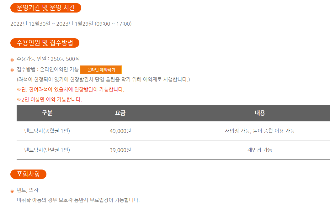 평창 송어축제 입장료는 아래 표를 확인하시기 바랍니다.평창 송어축제 텐트 낚시는 낚시대를 가져오셔도 되고, 축제장에서 별도로 구매하셔도 됩니다. 예약제이기 때문에 미리 온라인으로 예약 후 이용하셔야 합니다.