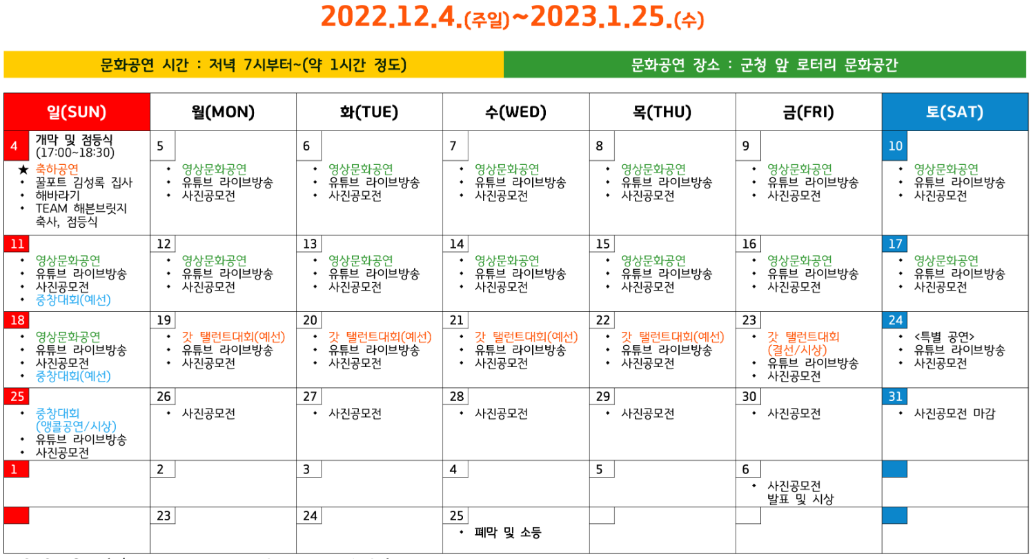 문화공연 시간은 저녁 7시부터 약 1시간 정도 진행이 되고 군청 앞 로터리 문화공간에 진행이 됩니다. 일정표에 있는 일정은 주최측의 사정에 따라 예고없이 변경될 수 있습니다.