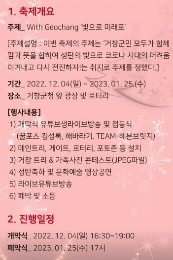 거창 크리스마스 문화트리축제는 2022. 12. 4(일요일)~20231. 25(수요일)까지 진행이 됩니다.