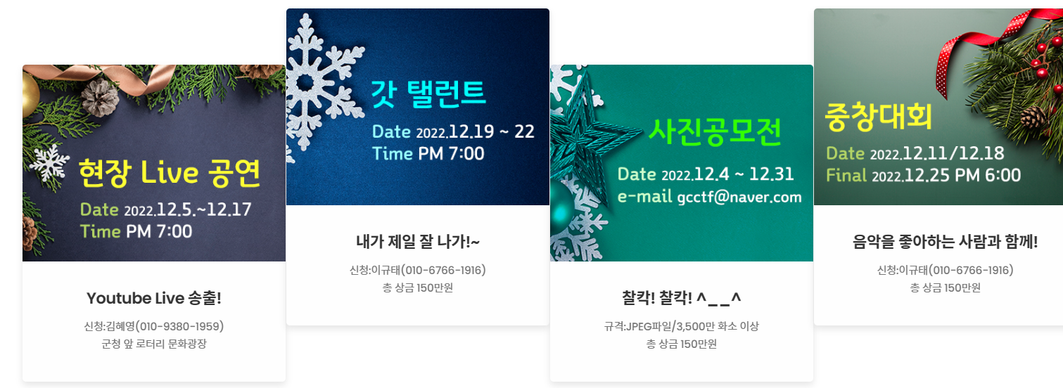 Marry Christmas! 영상문화공연, 유튜브 라이브방송, 사진공모전, 갓탤런트 대회많은 관심과 참여 부탁드립니다. 2022.12.4.(주일) ~2023.1.25.(수)