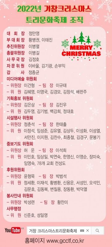 더 자세한 사항 및 문의사항은 거창 크리스마스 문화축제위원회 055-943-3579로 문의하실 수 있고 거창 크리스마스 문화트리축제 홈페이지에서 확인이 가능합니다. https://www.gcctf.co.kr/index.php