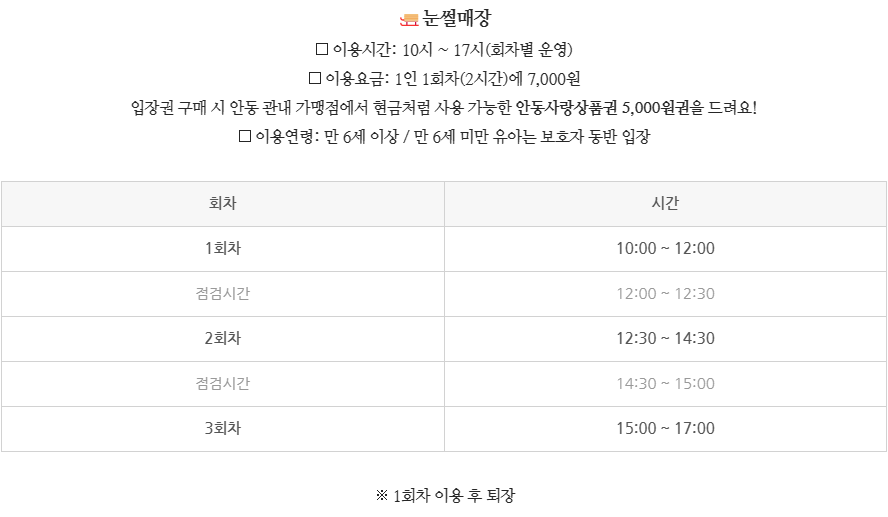 1회차 10시 ~ 12시까지 운영하고, 12시 ~ 12시30분까지 점검시간을 가지게 되어 점검시간에는 안동 눈빛 축제 눈썰매장 이용이 불가합니다.